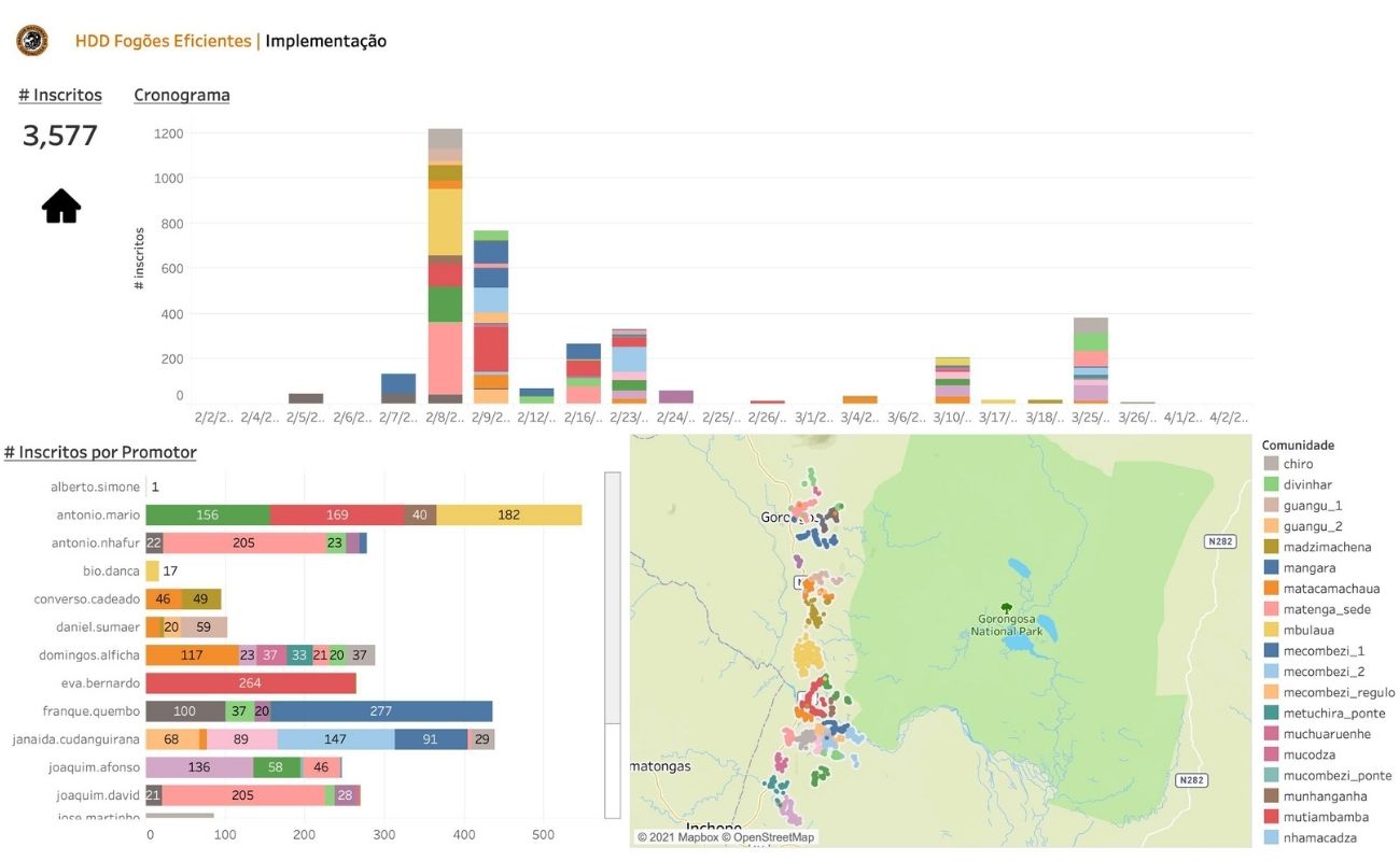 In February, Gorongosa began a pilot project to provide community members with clean and efficient cookstoves, designed to reduce pressure on forests for fuel while bringing health and economic benefits to families. The park created several, real-time dashboards that track the project rollout. Some dashboards provide a general summary (e.g., the number of registrations per day), while others deliver more insightful analysis (e.g., where households are, an estimate of how long it takes to acquire firewood, and how many people are helping gather it). With this information, they better understand what pressures are put on the forest and where to focus future cookstove efforts that will improve life—for nature and people.